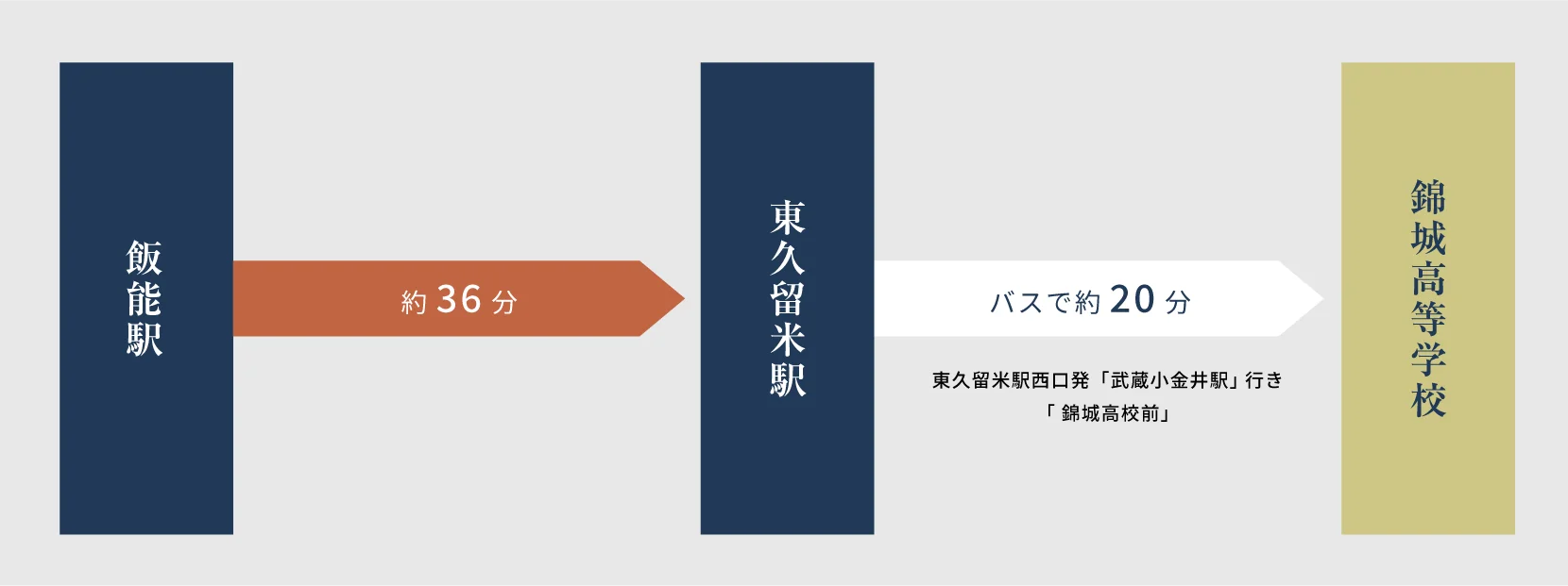 - 西武池袋ー(23分)ー東久留米ー(バス20分)ー錦城高校前