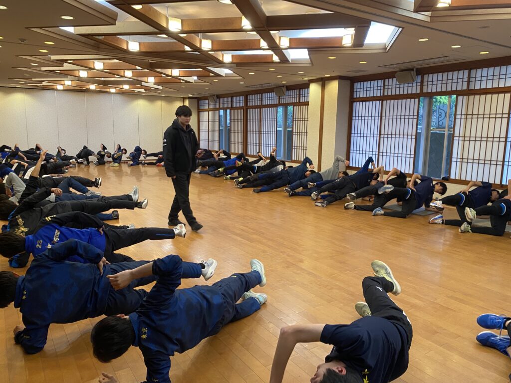 初日は降雨のため、ホテル内で筋力や体幹力アップを目指したトレーニングを行いました