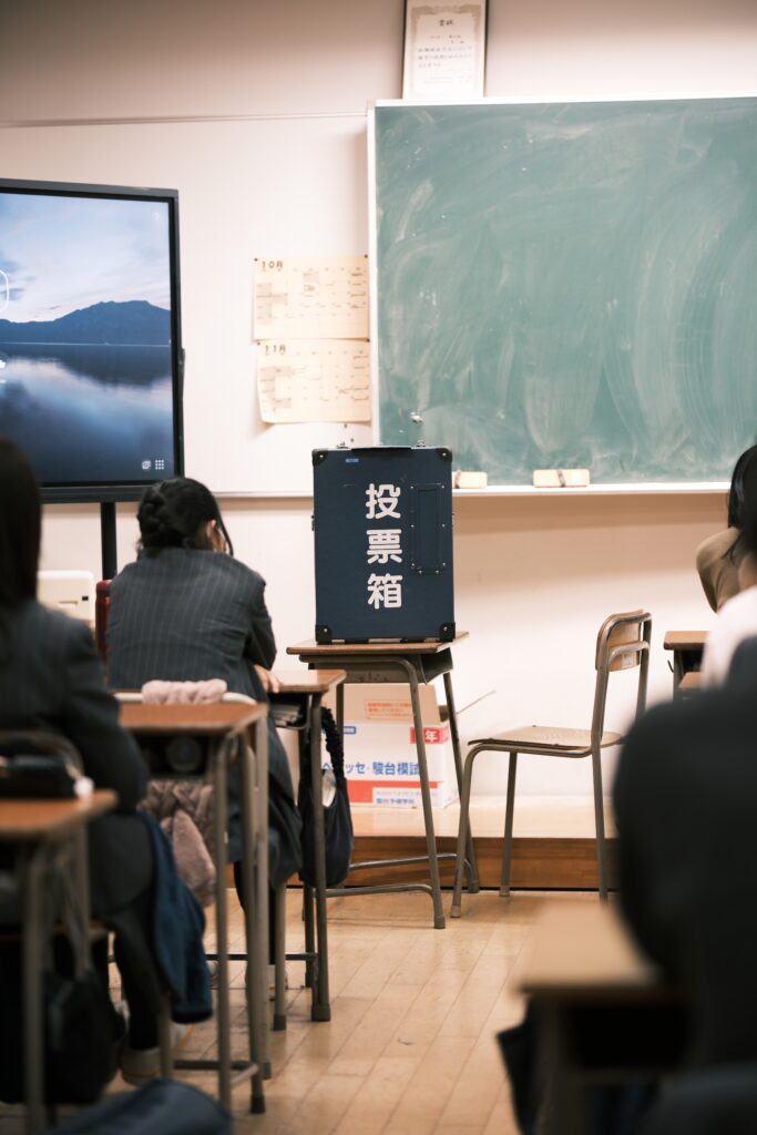 投票は各教室で行われました。投票箱は、小平市選挙管理委員会からお借りしている実際に本番の選挙でも使われているものです。