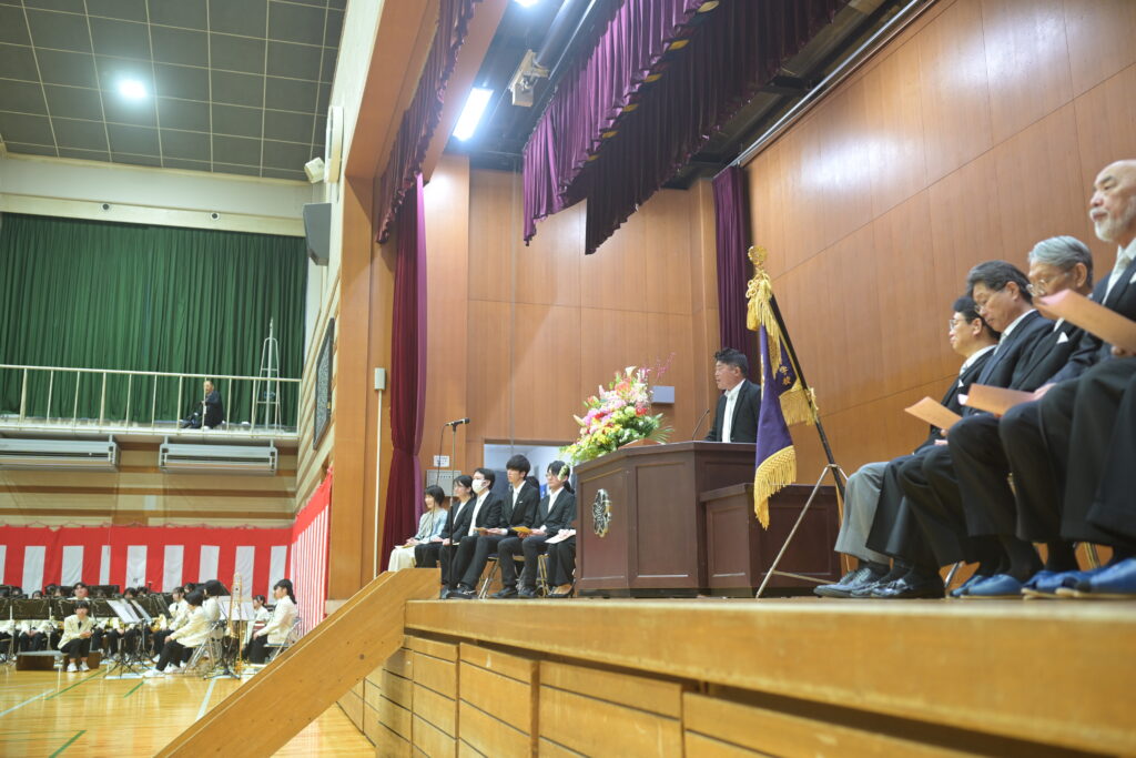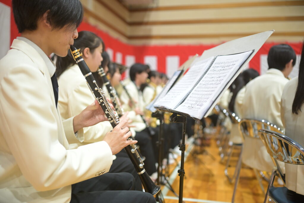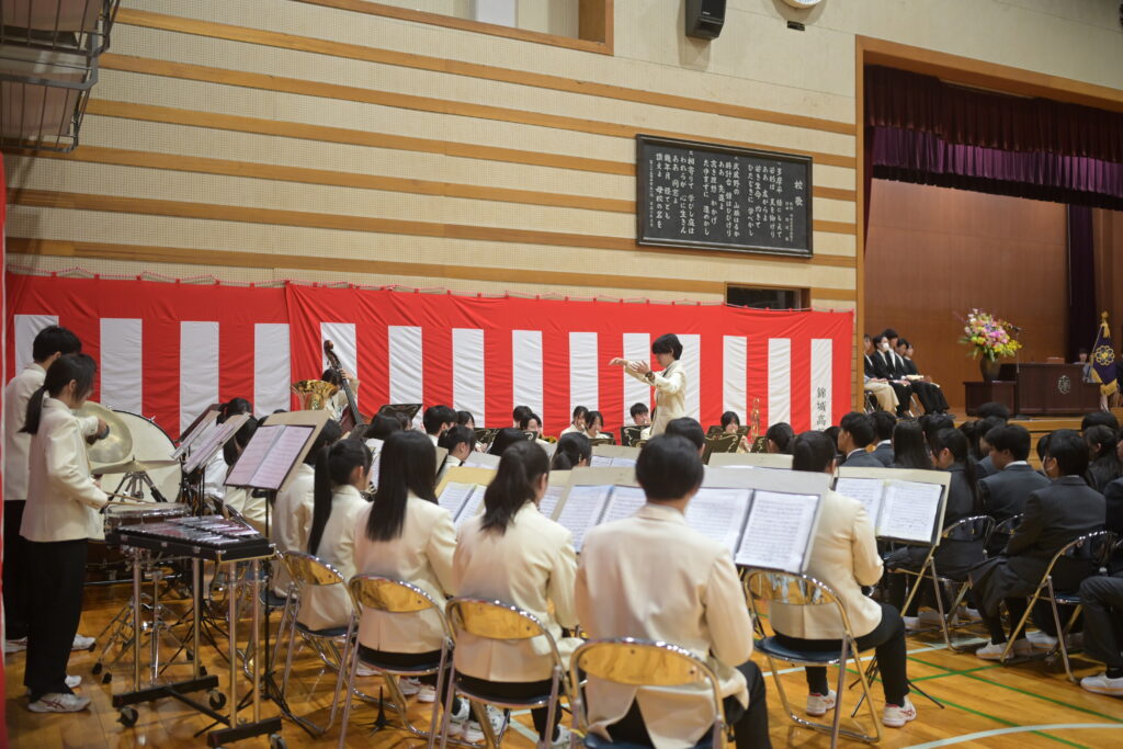 吹奏楽部が新入生の入学を祝い、エルガー作曲「威風堂々」を演奏しました。