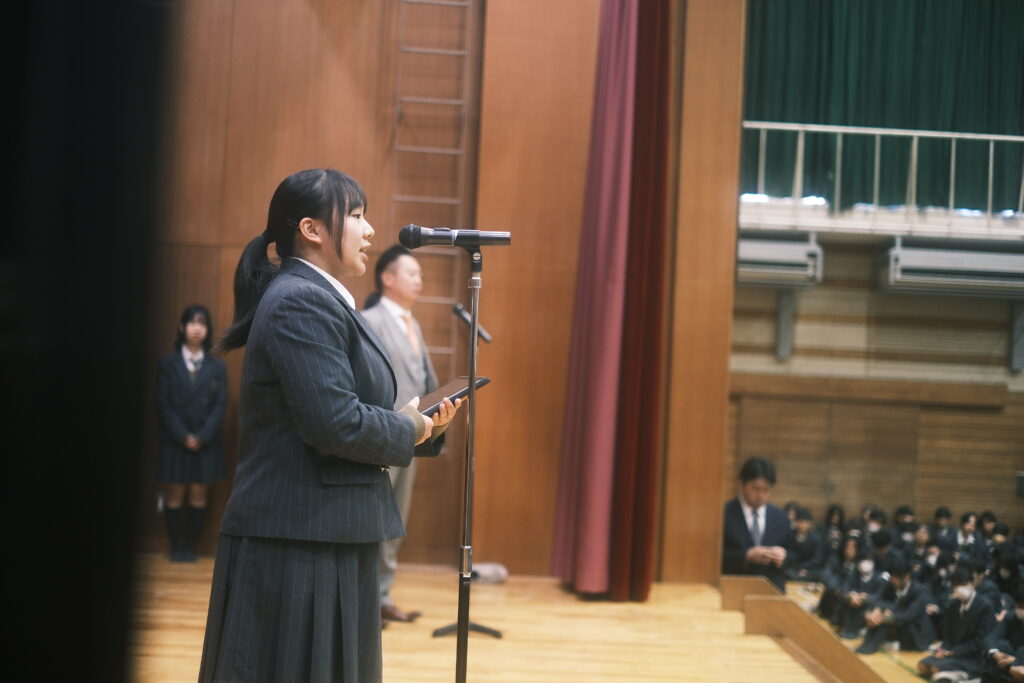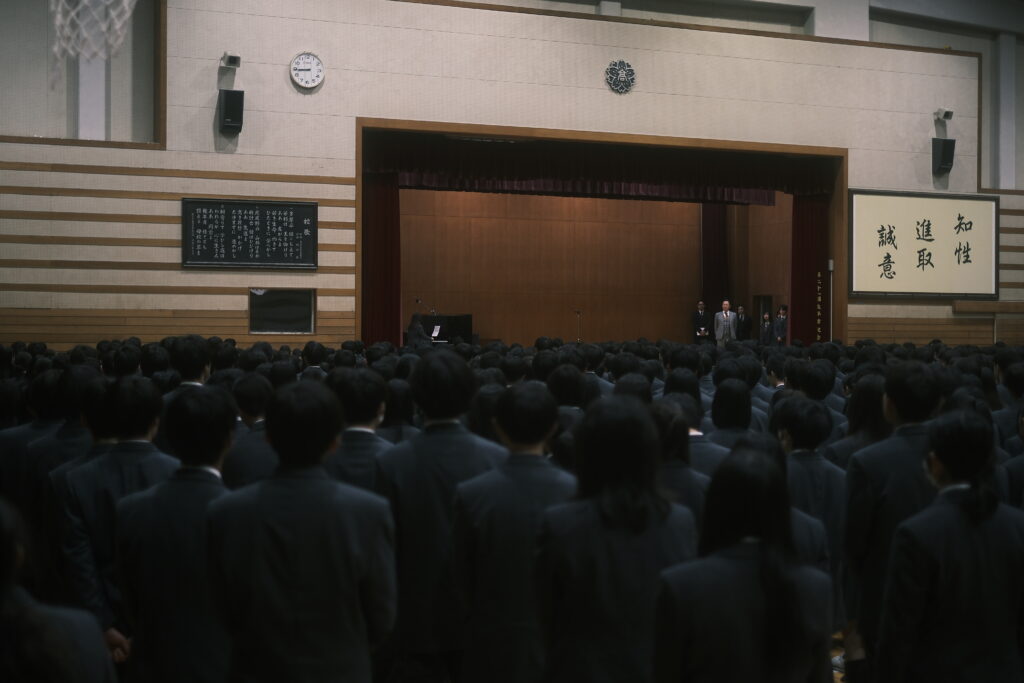 校歌斉唱。1年生から3年生まで揃って校歌を歌うのはこれが最後になります。